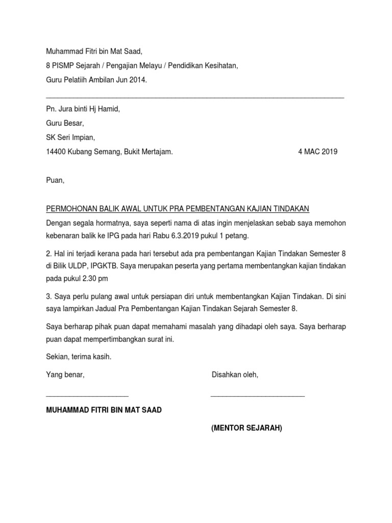 Contoh Surat Kebenaran Balik Kerja Awal. Surat Permohonan Balik Kampung - Contoh Surat Mohon Kebenaran Balik Awal Dari Sekolah Flip My Post a Comment D225 institut pendidikan guru kampus raja melewar jalan sikamat 70400 seremban notel. Surat Rasmi Balik Awal 2022-05-17T231100-0700 Rating.